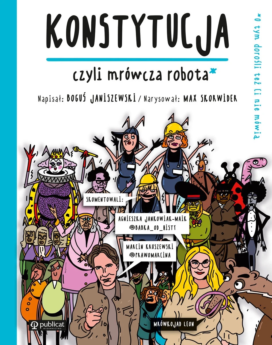 Autorzy opowiadają o mechanizmach władzy, podstawach demokracji i wolności obywatelskiej. Wciągająca historia, komiksowa formuła oraz spora dawka humoru. W mrowisku jedni zasuwają przez cały dzień jak mróweczki, a drudzy leżą do góry brzuchem i wcinają cukierki. To niesprawiedliwe, ale rządzi królowa matka i to ona decyduje, kto pracuje i ile za to dostaje. Czyli niby wszystko jest zgodnie z prawem. Przeczytaj o tym, jak dzięki dwóm małym mrówkom i ich mrówczej pracy autokrację zastąpiła demokracja, a królową matkę – matka wszystkich praw, czyli konstytucja. I co to wszystko ma wspólnego z naszym światem.